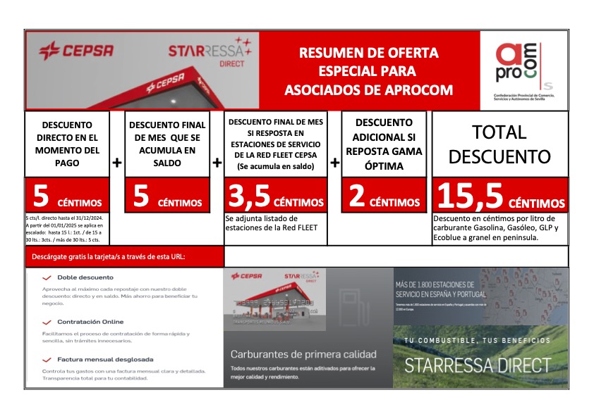 Le adjuntamos la promoción que CEPSA y Aprocom han prorrogado para el mes de diciembre de descuento en repostaje de combustible.