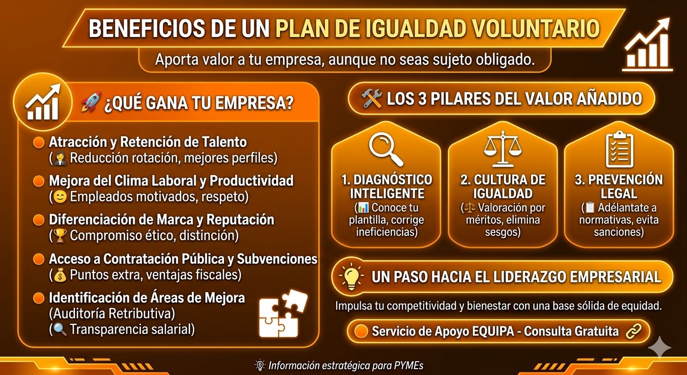 En el entorno empresarial actual, la responsabilidad social y la gestión del talento son pilares fundamentales para el éxito a largo plazo. Integrar un Plan de Igualdad en tu empresa, incluso cuando no eres un sujeto obligado legalmente (es decir, para empresas de menos de 50 trabajadores, según la normativa actual), es una decisión estratégica que aporta un valor incalculable.