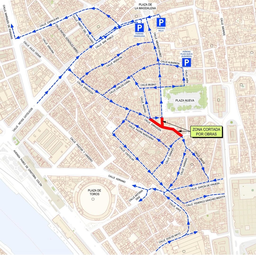 Se mantendrá el acceso a la Plaza Nueva a través de la calle Madrid, mientras que el acceso por la calle Badajoz quedará temporalmente interrumpido. Por su parte, durante las obras, las calles Gamazo, Jimios y Harinas modifican su sentido.
