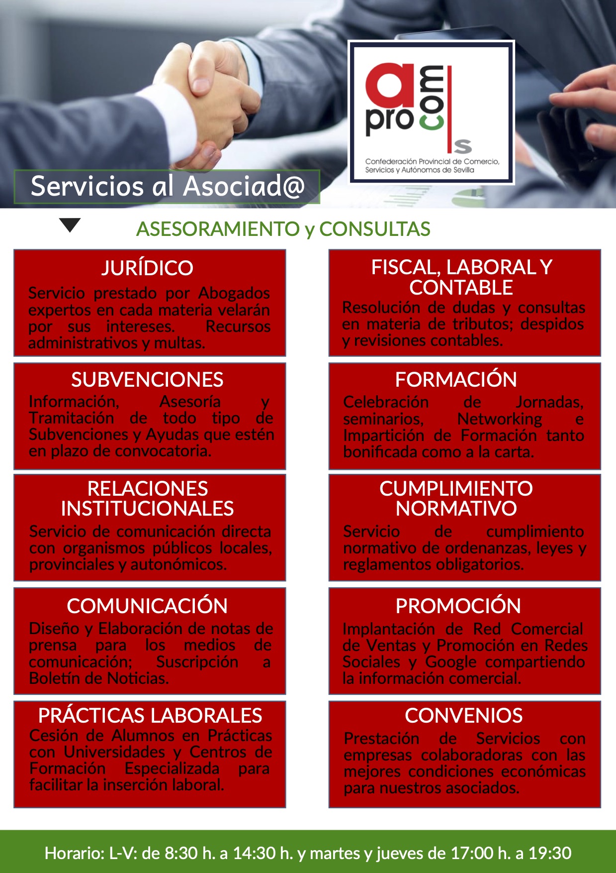 - Servicios de Subvenciones. Departamento Jurídico específico para la tramitación de subvenciones para la modernización de la pequeña y mediana empresa comercial, así como para la mejora de la calidad y competitividad en el pequeño comercio (Subvenciones Ayuntamiento de Sevilla, Subvenciones Junta de Andalucía, Subvenciones Cámara de Comercio, Subvenciones Distritos Municipales, Subvenciones Ministerio de Comercio)