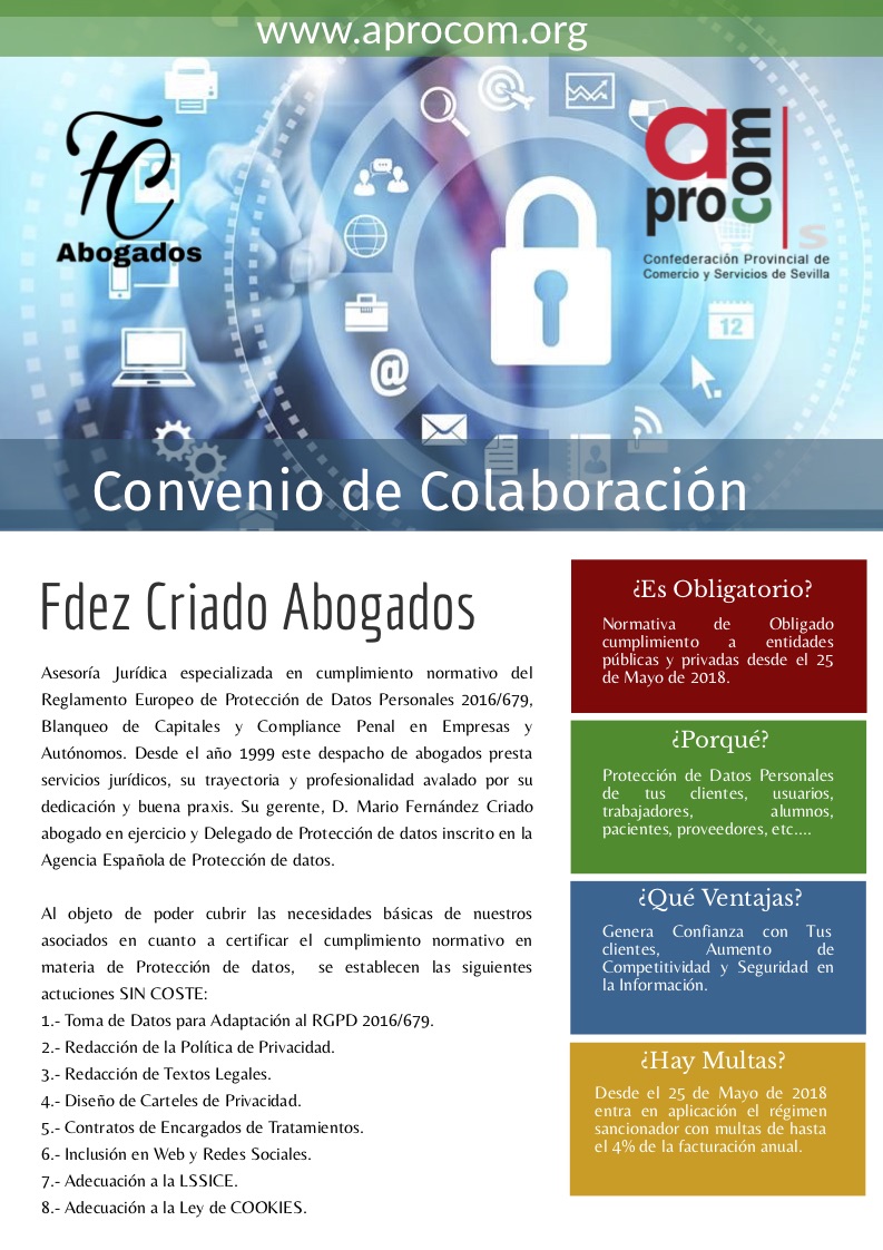 - Miembro del Consejo de Comercio del Ayuntamiento de Sevilla. El Presidente de Aprocom es Vicepresidente del Consejo de Comercio, en el que, por parte de Aprocom, se debaten, proponen, defienden y rechazan acciones y legislaciones relativas a la actividad comercial en la ciudad.